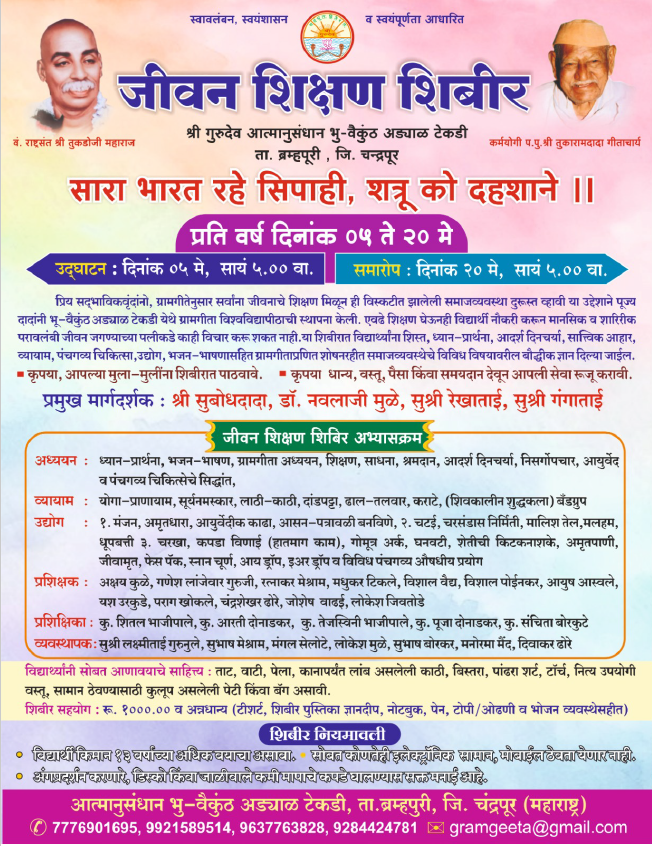 दिनांक 23 जानेवारी 2026 रोजी आत्मानुसंधान भू वैकुंठ, अड्याळ टेकडी येथे सुभाष चंद्र बोस जयंती व ग्रामसभा–पंचायत राज प्रशिक्षण शिबिराचे उद्घाटन उत्साहात पार पडले. कार्यक्रमास…
